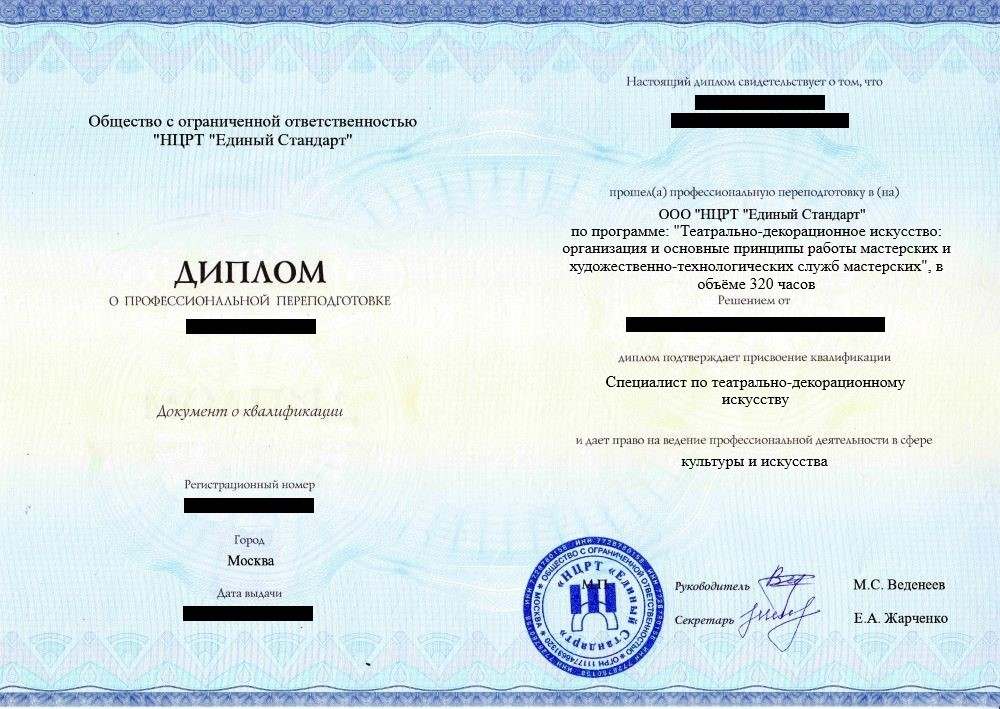 • «Специалист по театрально-декорационному искусству» с правом ведения профессиональной деятельности в сфере культуры и искусства