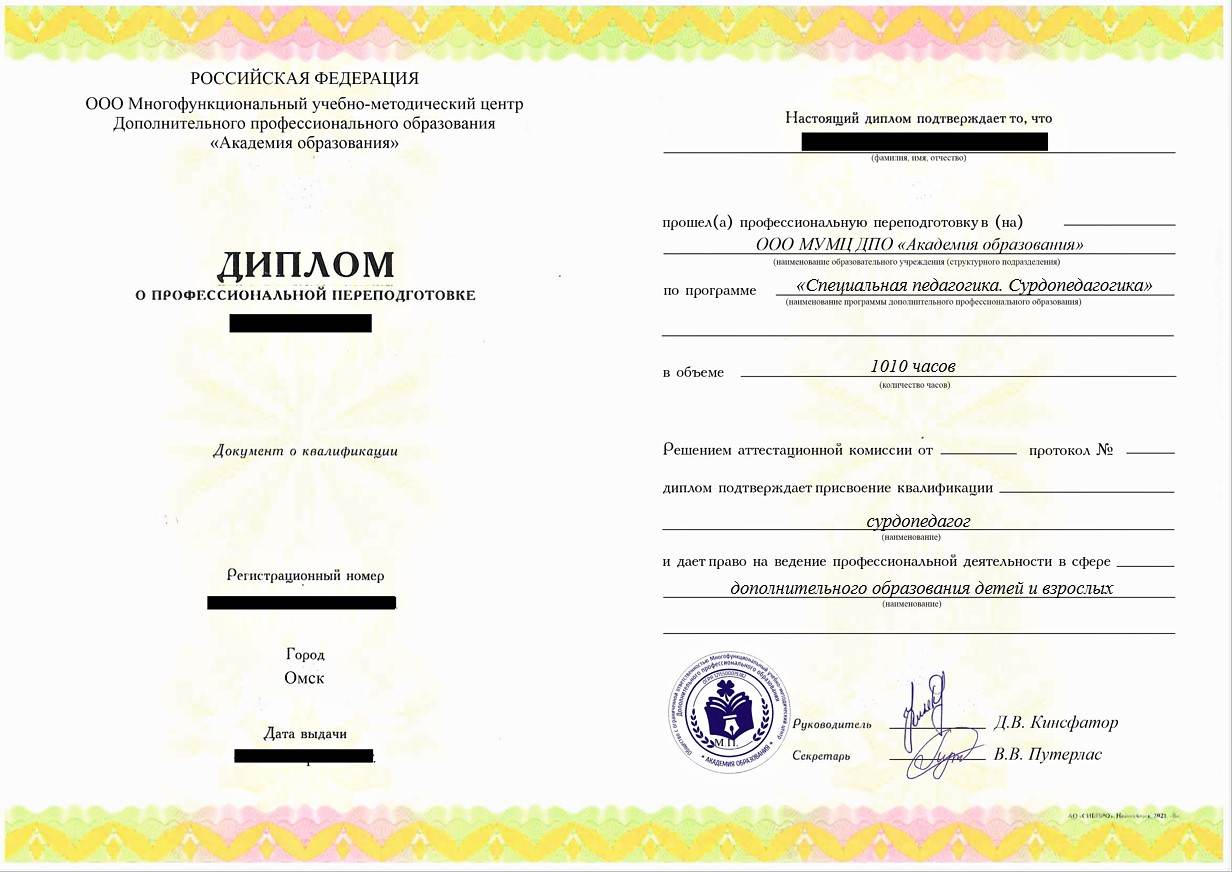 • «Сурдопедагог» с правом осуществления профессиональной деятельности в сфере дополнительного образования детей и взрослых
