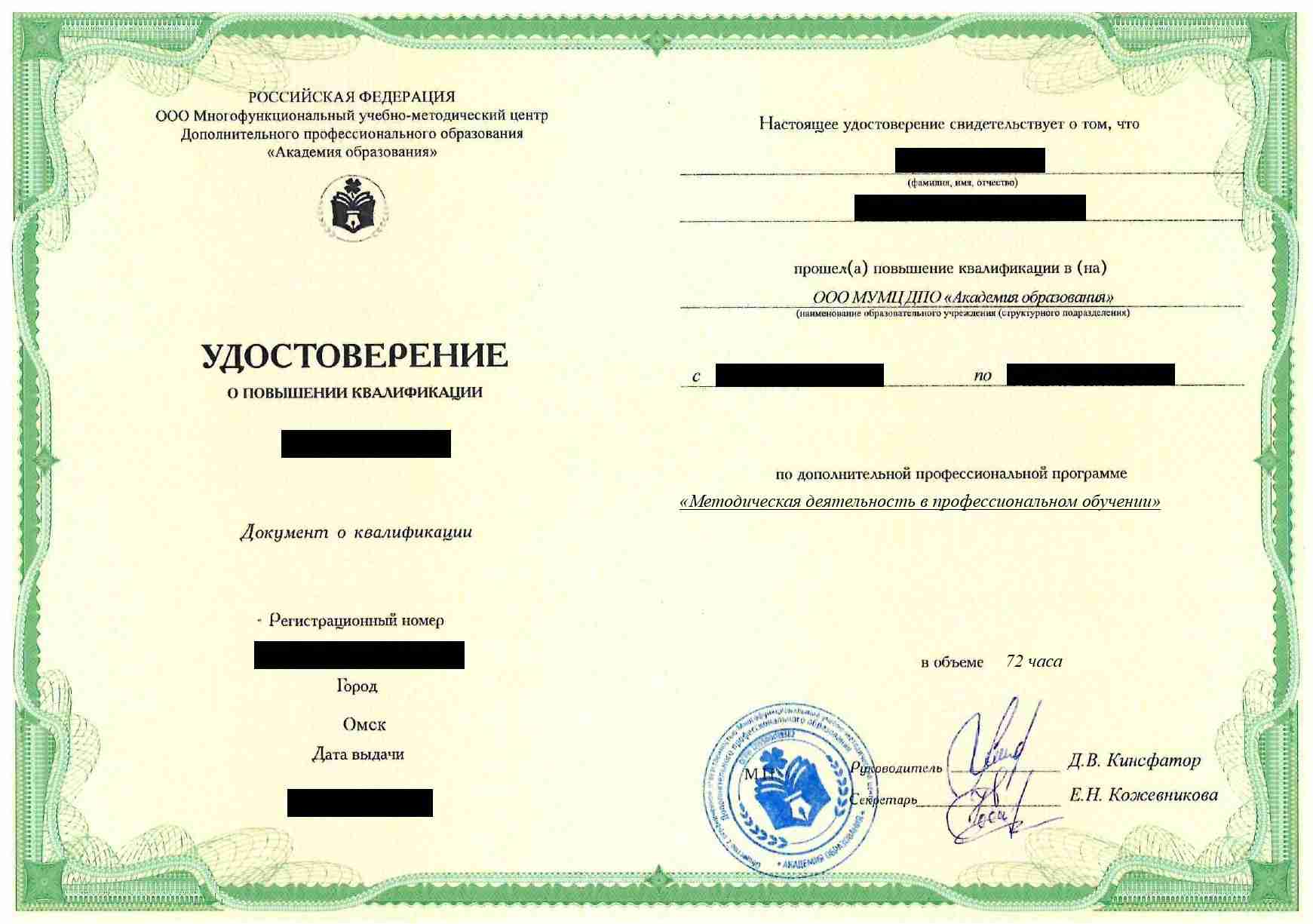 - Удостоверение о повышении квалификации установленного государством образца. Срок действия: 3 года